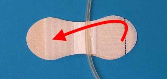 Trek het beschermpapier aan de achterkant eraf en plak de fixatie op een geschikte plaats op de gereinigde en ontvette huid. Verwijder vervolgens de beschermfolie van het klittenband, zoals op de foto, en steek de slang in het kleefvlak. Vervolgens de flap met klittenband sluiten, nogmaals licht aandrukken en de slang is veilig bevestigd.