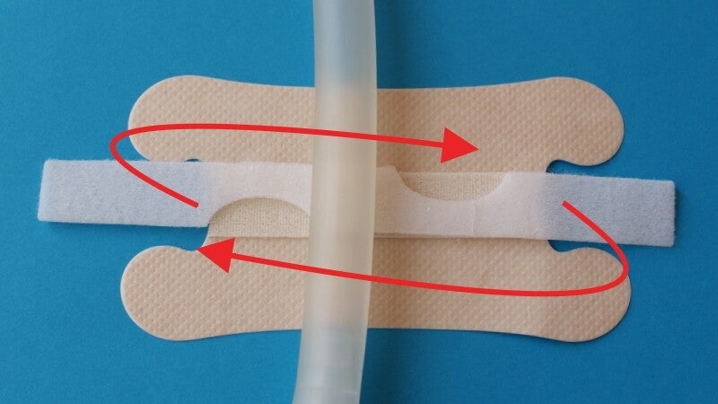 Verwijder vervolgens de beschermfolie van de houder en plaats de tube in de plakstrook, zoals op de foto. Druk kort aan en plaats met beide handen de uiteinden van de tape kruislings op de klittenbandstrook. Druk vervolgens licht aan.